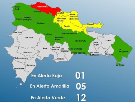 Hasta el momento, la provincia Puerto Plata se encuentra en alerta roja, mientras que cinco provincias están bajo alerta amarilla y doce en verde, debido al riesgo de crecidas de ríos, arroyos, cañadas e inundaciones repentinas.