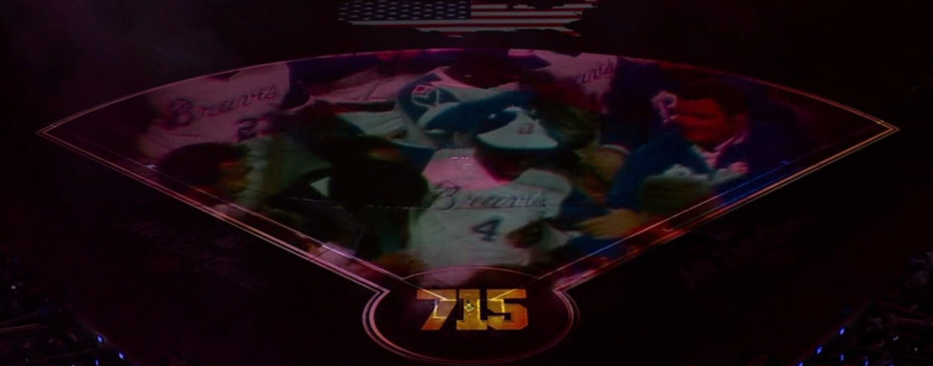 Con el estadio completamente a oscuras y las luces de los teléfonos celulares iluminando el ambiente, Major League Baseball y los Bravos de Atlanta presentaron una recreación virtual del legendario cuadrangular con el que Aaron superó a Babe Ruth el 8 de abril de 1974, convirtiéndose en el máximo jonronero de todos los tiempos en ese momento.