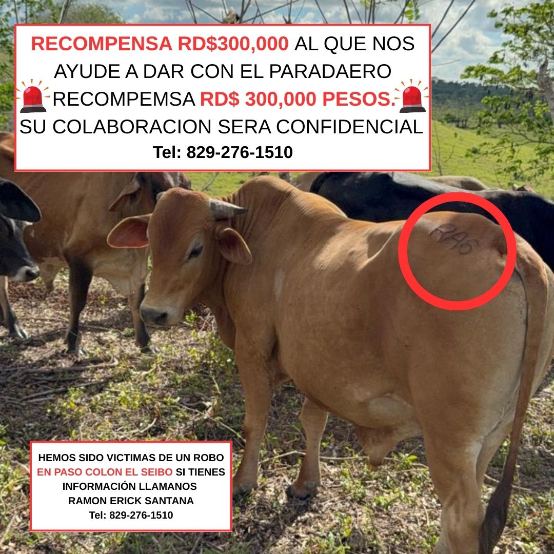Como parte de los esfuerzos para recuperar los animales, la familia está ofreciendo una recompensa de RD$300,000 a cualquier persona que pueda aportar información confiable y verificable que conduzca al paradero del ganado o de los responsables del hecho. Para colaborar con información, puede comunicarse con el señor Ramón Erick Santana al 829-276-1510.