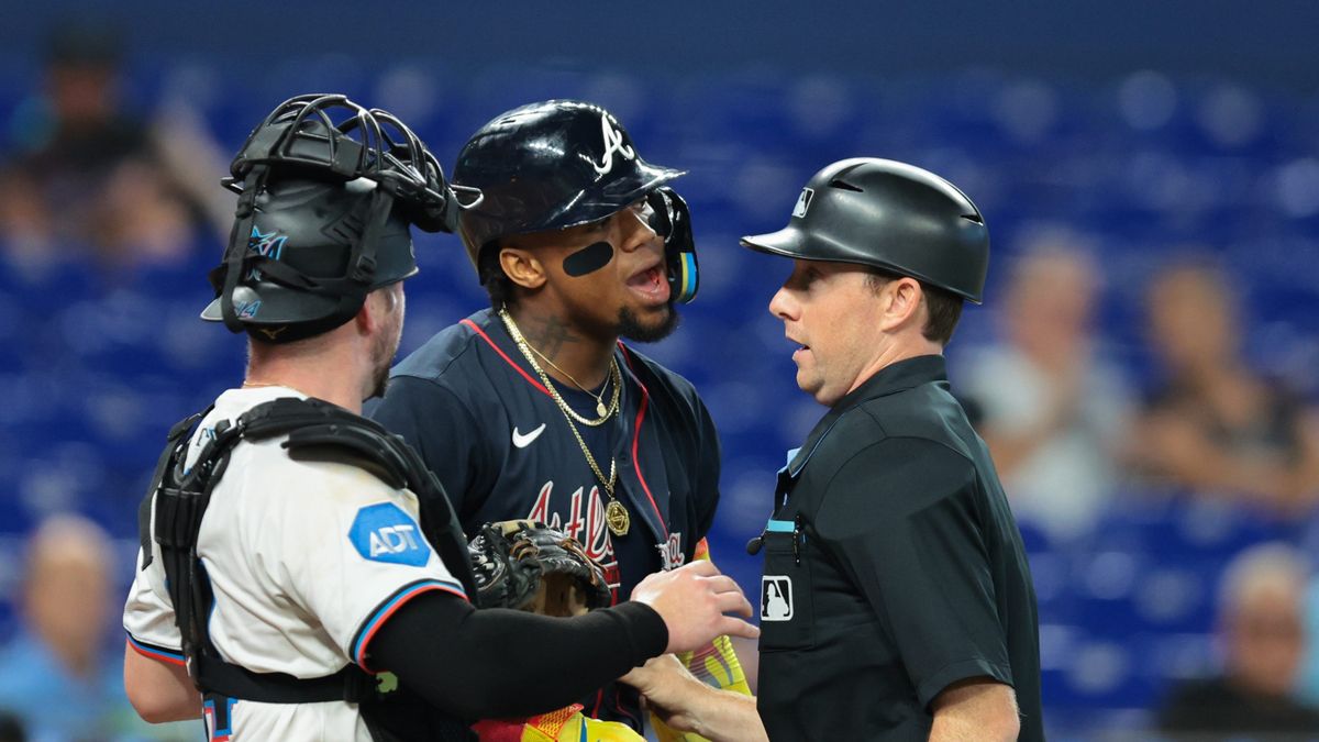 En la tercera entrada, un sinker de 93.3 millas por hora del lanzador Ryan Gusto golpeó el protector del brazo izquierdo de Acuña Jr., justo después de que Matt Olson conectara un cuadrangular de dos carreras. El contacto generó la inmediata molestia del venezolano, quien avanzó unos pasos hacia el montículo antes de ser contenido.