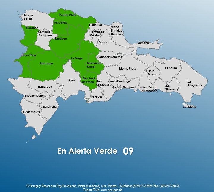 Santo Domingo.- El Centro de Operaciones de Emergencias (COE) amplió este lunes la alerta verde a nueve provincias por posibles crecidas de ríos, arroyos y cañadas, así como por inundaciones repentinas o urbanas; los territorios afectados son: Santiago, San Juan, Dajabón, Monseñor Nouel, La Vega, Elías Piña, San José de Ocoa, Puerto Plata y Valverde.