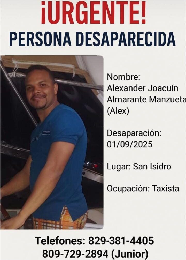 Almarante Manzueta, quien se desempeña como taxista, salió de su residencia y desde entonces no se tienen noticias sobre su ubicación. Ante la preocupación de sus familiares, el caso fue formalmente notificado al Departamento de Investigación y Búsqueda de Personas Desaparecidas (DICRIM) de la Policía Nacional, entidad que emitió un documento oficial certificando su condición de desaparecido.