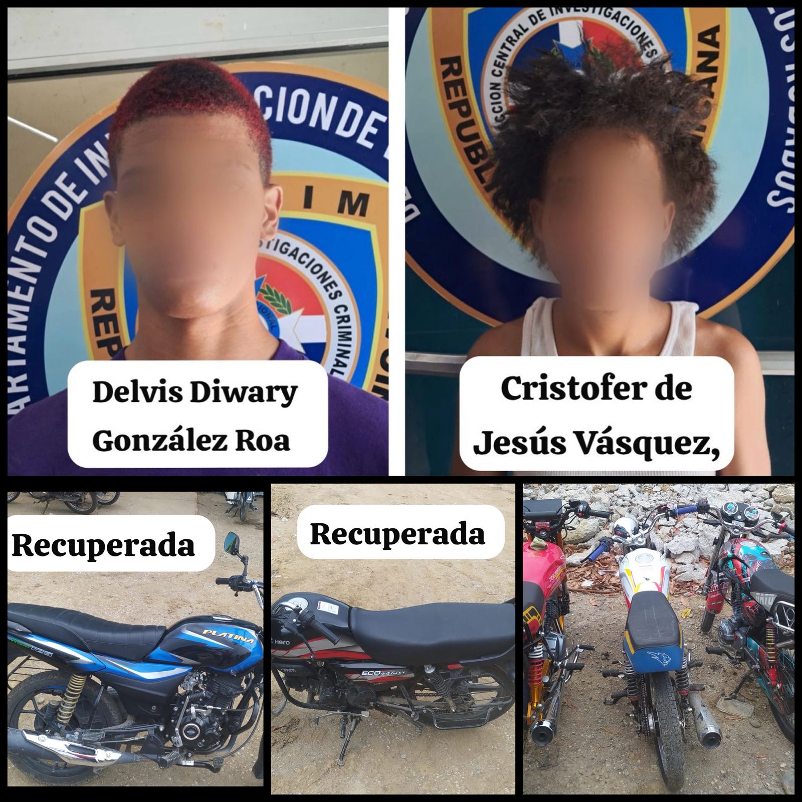 Santiago de los Caballeros, R.D. – La Policía Nacional informó el arresto en flagrante delito de dos hombres vinculados al robo a mano armada de una motocicleta y un teléfono celular, hecho ocurrido en la mañana del pasado 9 de septiembre en el sector Matanza Adentro, municipio de Puñal, logrando además la recuperación del vehículo sustraído.