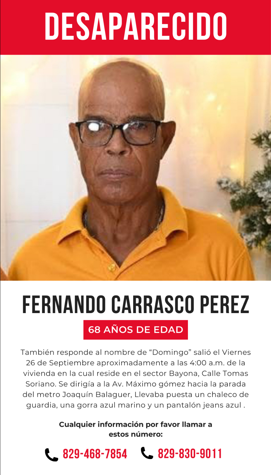 Según informan, Carrasco Pérez salió de su vivienda el viernes 26 de septiembre, alrededor de las 4:00 a.m., en el sector Bayona, Calle Tomás Soriano, con dirección a la Avenida Máximo Gómez, hacia la parada del metro Joaquín Balaguer, y desde entonces no se tiene información sobre su paradero.