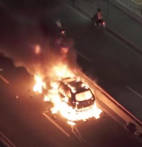 Santo Domingo.- Esta noche, un vehículo se incendió en el elevado de la avenida John F. Kennedy con Abraham Lincoln, en el Distrito Nacional, provocando congestión vehicular en la zona.