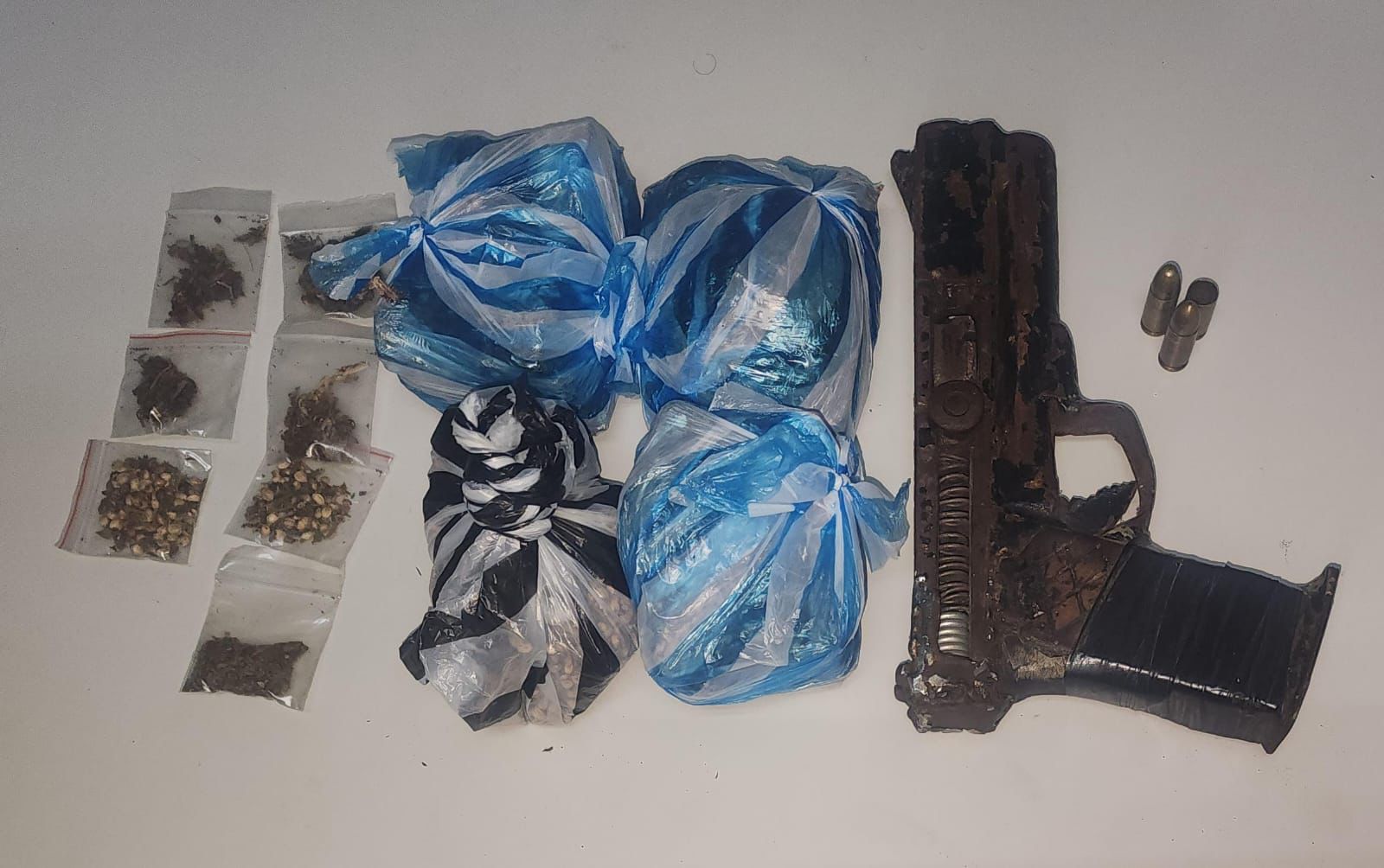 En el lugar, la Policía confiscó el arma utilizada, con dos cápsulas calibre 9 mm, así como una funda negra que contenía aproximadamente 342.8 gramos de sustancias presumiblemente marihuana, divididas en varias porciones.