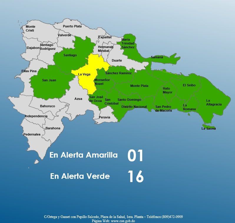 Santo Domingo.- El Centro de Operaciones de Emergencias (COE) mantiene la alerta amarilla por lluvias en La Vega y la alerta verde en un total de 16 provincias del territorio dominicano debido al paso de una onda tropical asociada a un centro de baja presión ubicada a cientos de kilómetros al sur de Puerto Rico, informó este lunes la institución.