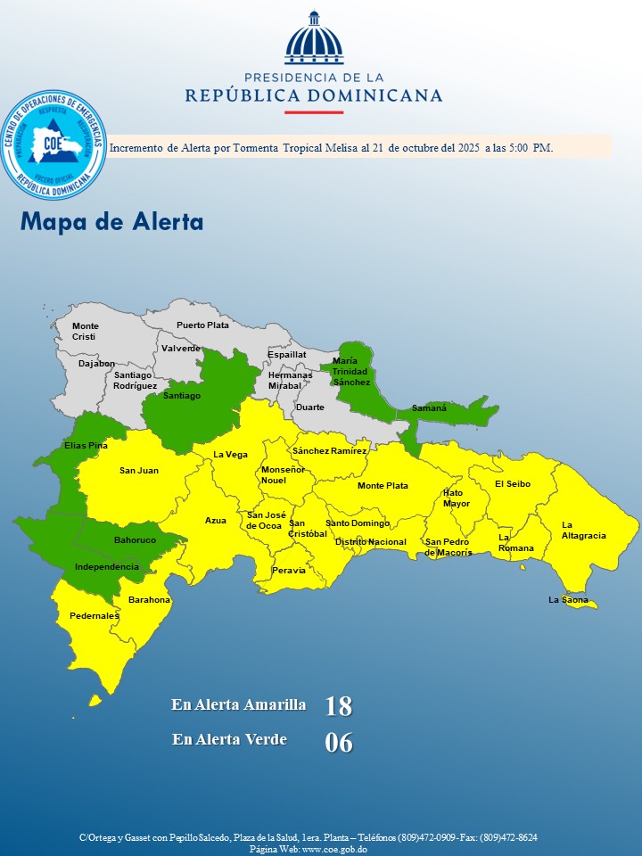 Santo Domingo.- El Centro de Operaciones de Emergencias (COE) aumentó a 24 las provincias en alerta, 18 en amarilla y 6 en verde, debido al efecto de la tormenta tropical Melissa, que se encuentra a unos 415 kilómetros al sur/suroeste de Barahona, informó en la tarde de este martes la institución.