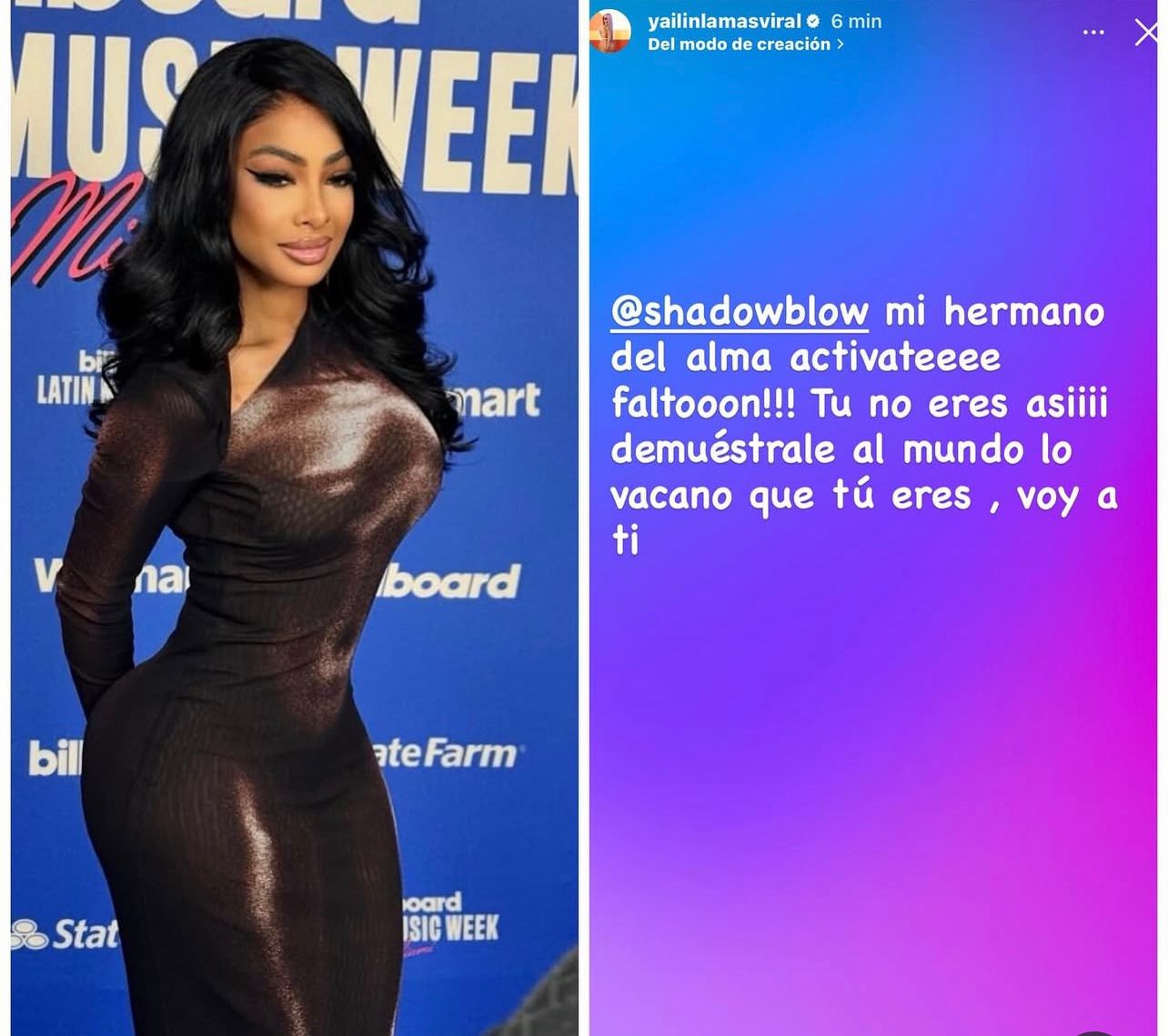 En una historia publicada en su cuenta de Instagram, Yailin escribió: “@shadowblow mi hermano del alma, activateee faltóoon!!! Tú no eres asiii, demuéstrale al mundo lo vacano que tú eres. Voy a ti.”