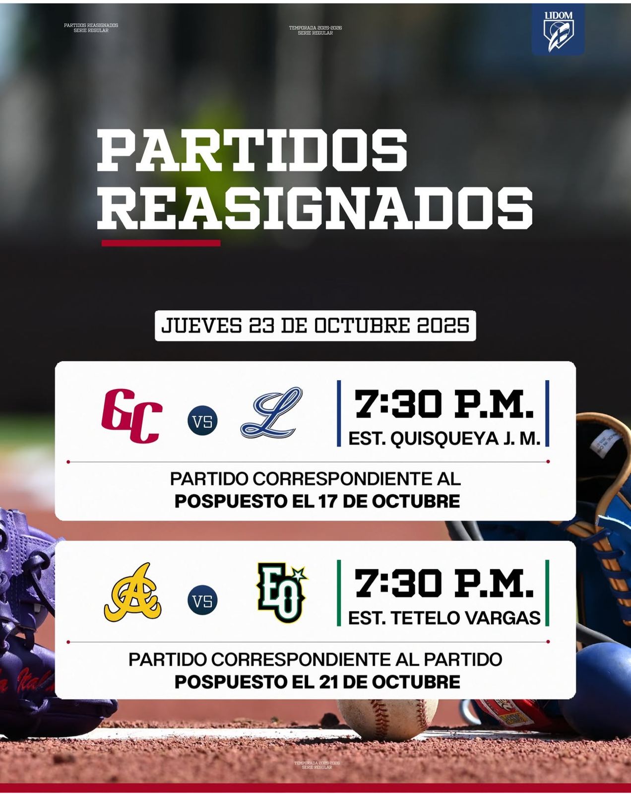 Santo Domingo.– La Liga de Béisbol Profesional de la República Dominicana (LIDOM) anunció la reasignación de dos partidos correspondientes a fechas previamente suspendidas debido a los efectos de la tormenta tropical Melissa, los cuales se disputarán el jueves 23 de octubre de 2025.