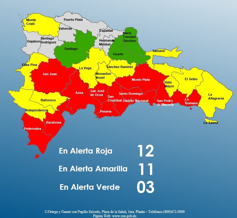 Las provincias en alerta roja son: Barahona, San Cristóbal, Santo Domingo, Distrito Nacional, San José de Ocoa, San Pedro de Macorís, San Juan, Azúa, Peravia, Pedernales, La Romana y Monte Plata.