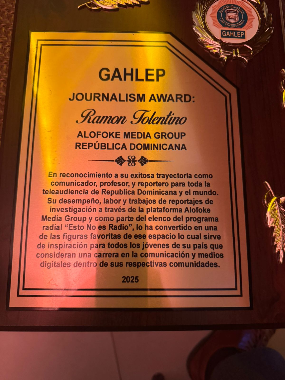 SANTO DOMINGO, República Dominicana. – El destacado periodista de investigación Ramón Tolentino recibió este domingo un importante reconocimiento otorgado por la Alianza Global de Profesionales Hispanos de las Fuerzas del Orden (GAHLEP, por sus siglas en inglés).