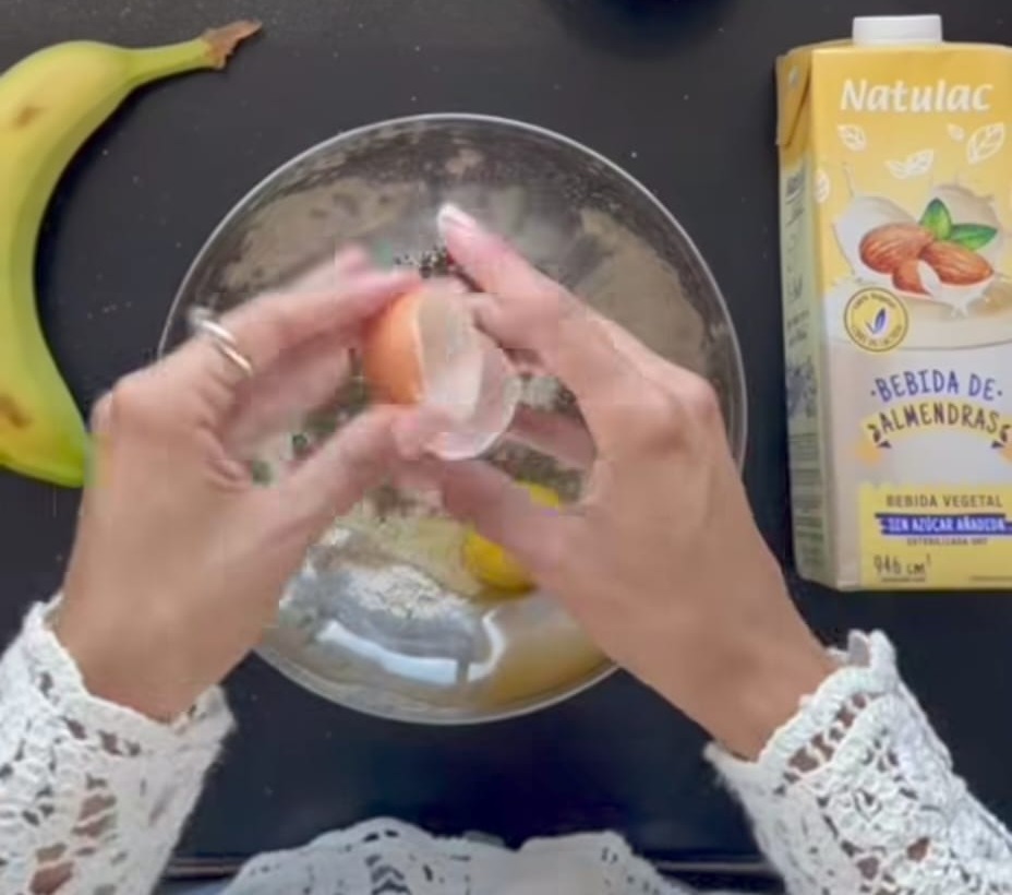 - Integra en un bol la harina de avena, la avena en hojuelas, los dos huevos, una pizca de canela en polvo y el bicarbonato. Bate todo hasta que no haya grumos.