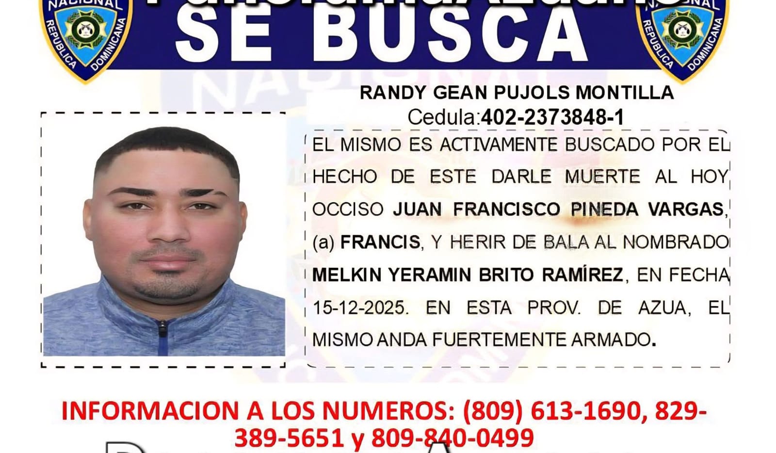 La Policía Nacional informó que mantiene activa la búsqueda de Randy Gean Pujols Montilla, quien figura como requerido por las autoridades judiciales por su presunta vinculación en un hecho violento ocurrido en la provincia de Azua. La institución reiteró su compromiso de continuar las labores de localización y captura conforme a lo establecido en la ley.