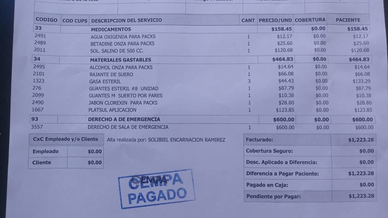 Posteriormente, al contactar a su aseguradora SEMMA ARS, el ciudadano, quien se desempeña como maestro, confirmó que se le había cobrado de manera indebida un monto ascendente a RD$1,223, correspondiente a insumos incluidos en el referido kit y al derecho de emergencia, conceptos que, según la aseguradora, están contemplados dentro de la cobertura del seguro.