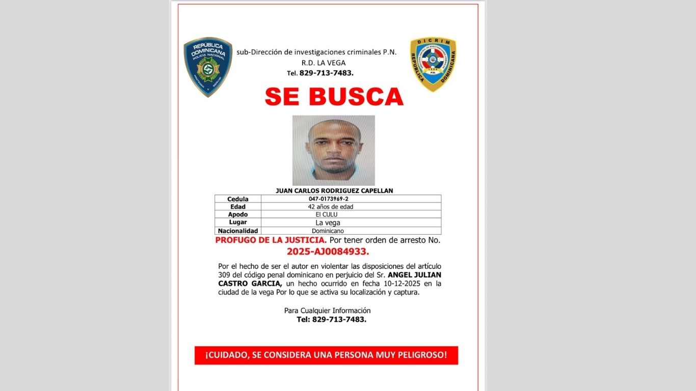 De acuerdo con las autoridades, Rodríguez Capellán posee una orden de arresto No. 2025-AJ0084933, por la presunta violación de las disposiciones del artículo 309 del Código Penal Dominicano, en perjuicio del ciudadano Ángel Julián Castro García, en un hecho ocurrido el 10 de diciembre de 2025, en la ciudad de La Vega.