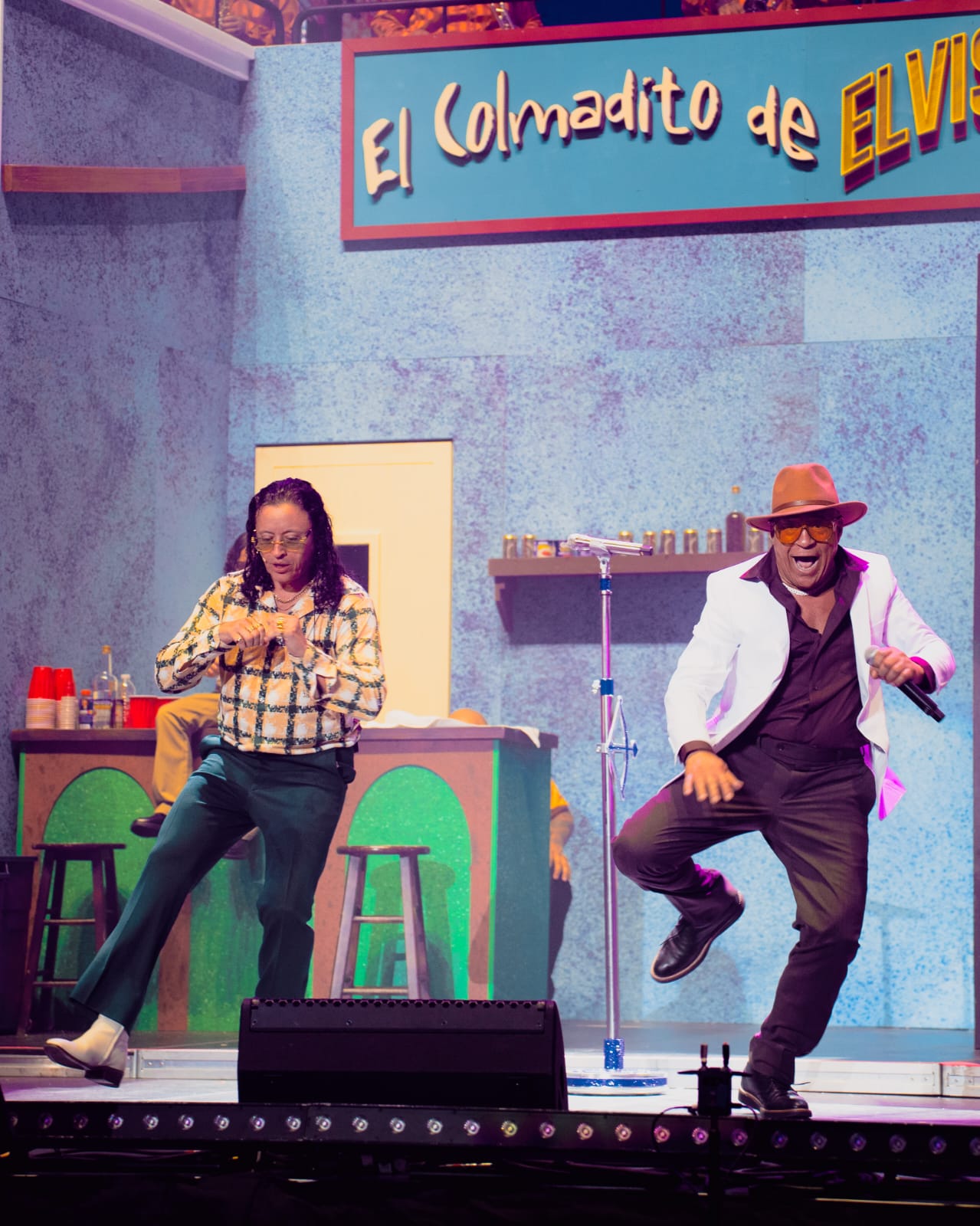 El espectáculo estuvo respaldado por una llamativa escenografía que recreó un colmado típico de la década de 1970, junto a una barbería y una barra en tarima, evocando los orígenes del artista.