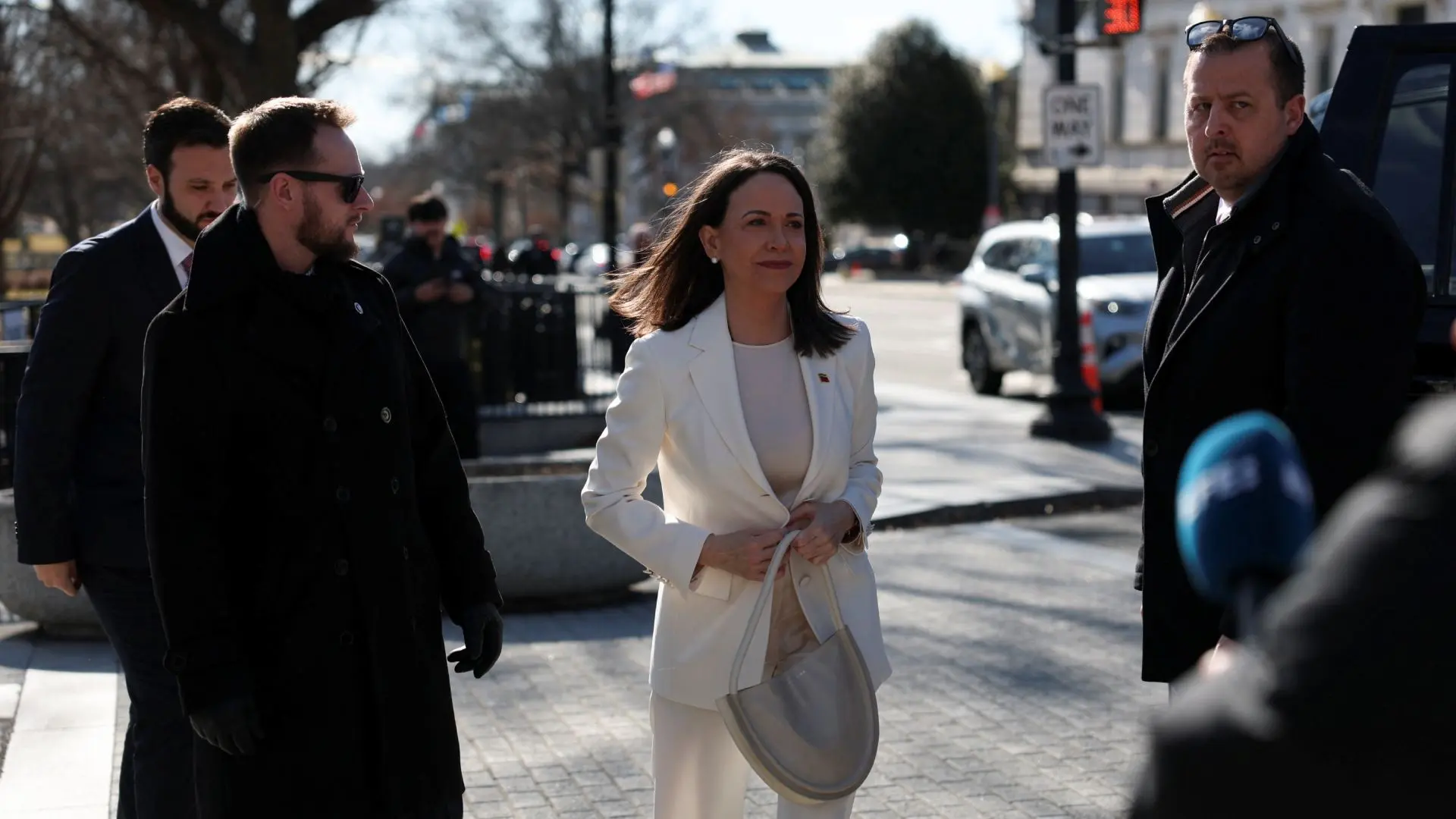 La líder opositora venezolana entró este jueves a la residencia ejecutiva estadounidense por una puerta lateral en lugar de por la entrada principal, reservada a jefes de Estado y altos dignatarios, y no respondió preguntas de la prensa.