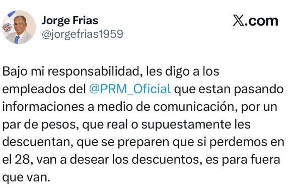 “Bajo mi responsabilidad, les digo a los empleados del @PRM_Oficial que están pasando informaciones a medios de comunicación por un par de pesos, que real o supuestamente les descuentan, que se preparen, porque si perdemos en el 28, van a desear los descuentos; es para fuera que van”, escribió.