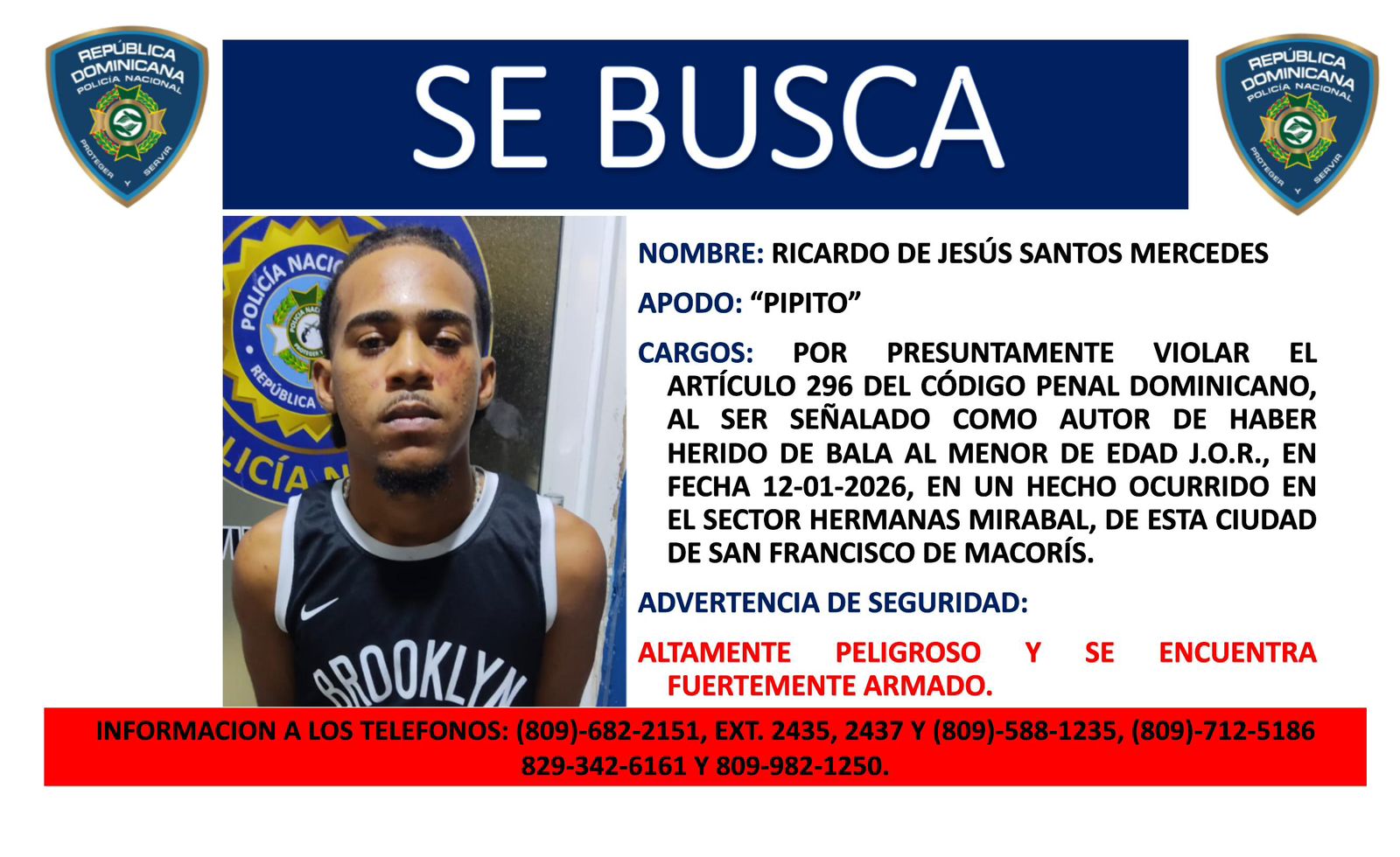La Policía exhortó a “Pipito” a que se entregue por la vía que considere pertinente, ya sea a través de un abogado, un líder comunitario o directamente en el cuartel policial, para evitar mayores consecuencias.