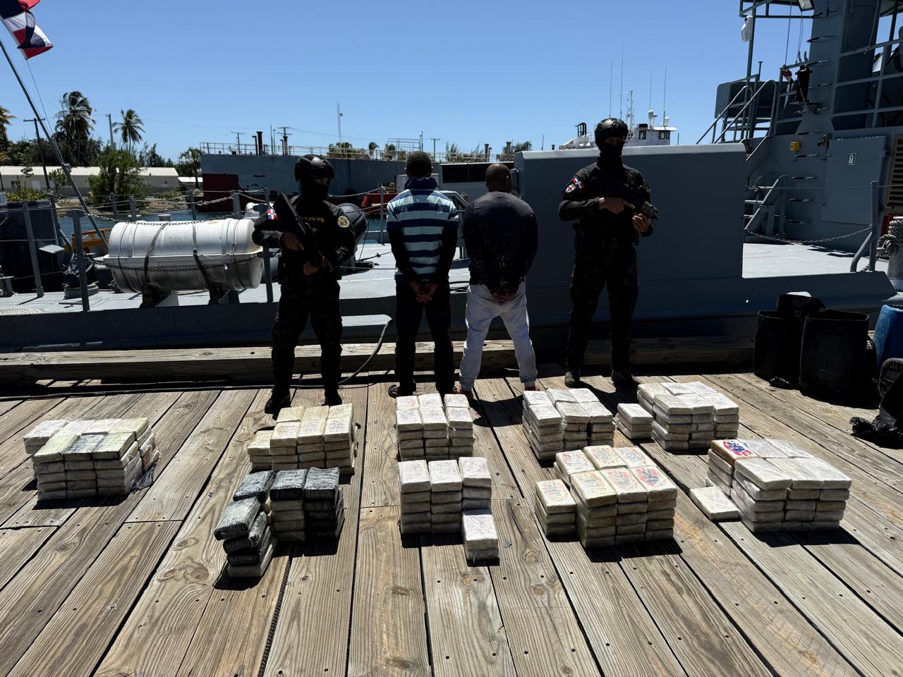 Producto del despliegue de las fuerzas y luego de varias horas de intensa persecución, las autoridades dominicanas, con el apoyo de organismos internacionales, lograron interceptar a varias millas náuticas al sur de las costas de Baní una lancha con dos hombres a bordo y un supuesto cargamento de presunta cocaína.