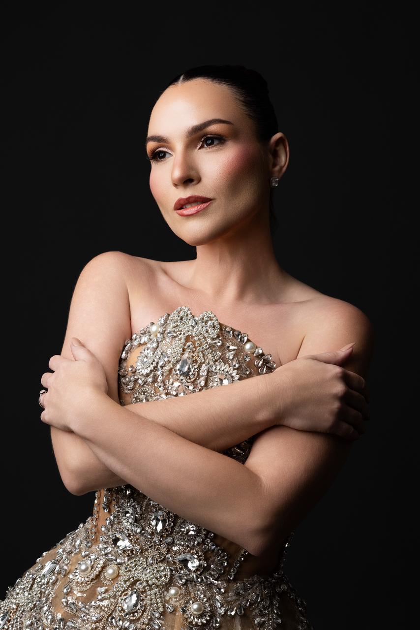 La actriz, productora y directora de casting, Katyuska Licairac, lleva una creación de la maestra Giannina Azar a la alfombra roja de Premios Soberano 2026.