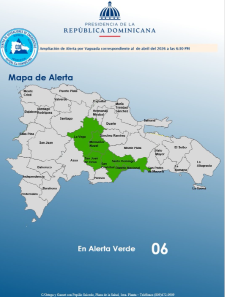 Las zonas bajo alerta verde son: Santo Domingo, Distrito Nacional, San Cristóbal, Monseñor Nouel, La Vega y San José de Ocoa.