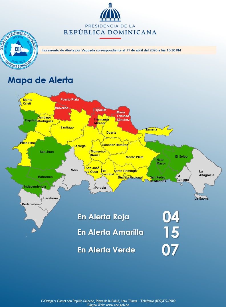 Santo Domingo.– El Centro de Operaciones de Emergencias (COE) elevó a cuatro las provincias en alerta roja, mientras que 14 y el Distrito Nacional se encuentran en amarilla y siete en verde, para un total de 26 demarcaciones bajo algún nivel de alerta, debido a las lluvias provocadas por una vaguada asociada a un sistema frontal.