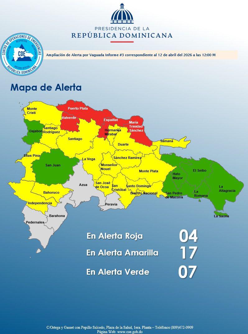 En ese sentido, en alerta roja se encuentran las provincias Puerto Plata, Espaillat, María Trinidad Sánchez y Valverde.