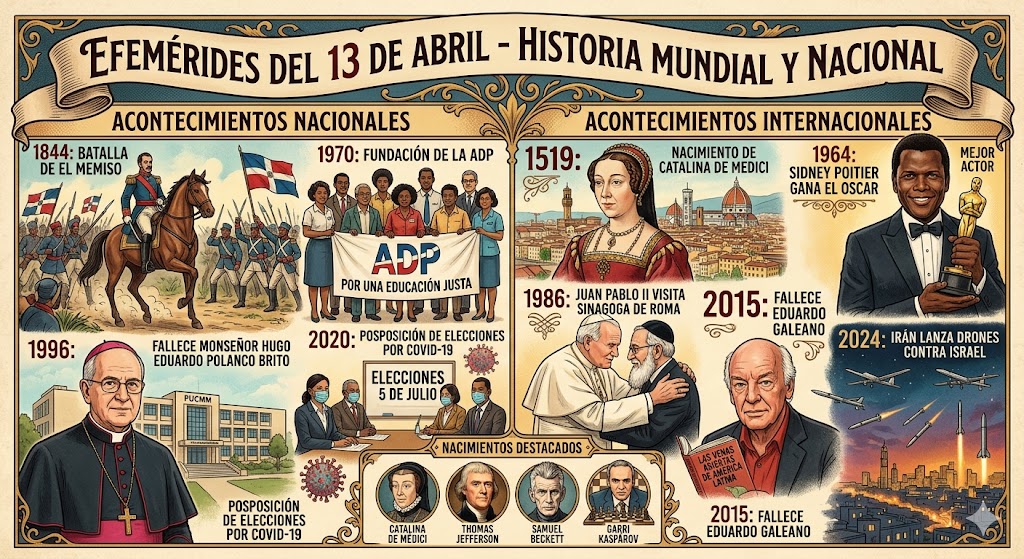 Santo Domingo.- Las efemérides del 13 de abril, están marcadas por importantes acontecimientos históricos y celebraciones internacionales que dejaron huella en la historia mundial. A continuación, las principales efemérides del 13 de abril: