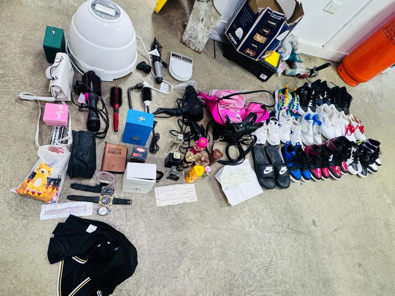 Como parte del proceso, las autoridades ejecutaron un allanamiento, en coordinación con el Ministerio Público, en una vivienda del sector La Barranquita, amparado en la orden judicial No. 2026-AJ0029493. En el lugar fueron recuperados calzados, relojes, perfumes, prendas de vestir, equipos electrónicos y diversos artículos reportados como robados.